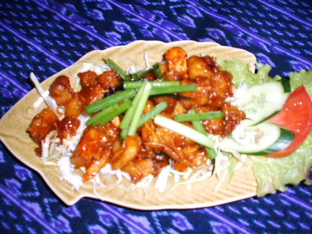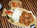 さて、まずは飲み物…シンハービールの人〜! は〜い! ヌゥン、ソン、サァーン、シィー、ハァー…こぉー、しんはーびぁー、ハァー、ゲオ!(;シンハービール5本下さい→これくらいならなんとか言えます。発音をマダム(美人)に直されましたが)なんとか注文できました。先生はマンゴージュースで、かんぱ〜い! 前菜には、もちろんソムタム・タイ(青いパパイヤの辛いサラダ)。ピーナッツがアクセントになった、シャキシャキのサラダです。辛さで舌がピリピリしてきたら、付け合わせのミニトマトを頂くと落ち着きます。私は3年前札幌で初めて食べやみつきになり、その後バンコクで目の前で作ってもらったのを食べてから、タイ料理の時は必ず注文します(冬場は材料が無い時もあるので注意)。 生春巻き。こちらのお店は、やわらかめに巻いてあります。ソースは初め甘く感じますがぴりっと来ます。が、野菜が沢山入っているからかそんなに辛くありません。 魚のつみれの揚げ物。私は初めて頂きました。タレが生春巻きのものと似ている? 練り物好きの方には嬉しい味でしょう。ビールが進みます。 |