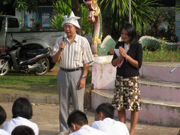 初めてタイからのお便りをお送りします。 坂口和夫 氏名は、タイ式では『名はカズオ、姓はサカグチ、呼び名はカズオ』と言います。 (ズの発音は難しくカスオになります)カズオ・サカグチと略してはいけません。 年齢は、小学校教員を退職した後、更に保育園に6年半ほど勤め、2度目の退職をして既に10年近く過ぎましたので、今は立派な後期高齢者です。その後言い方は変わったそうですが、一度つけられたレッテルは簡単に剥がせるものではありません。 長くなりましたが、戦中戦後をやや苦労して生きてきた、少し頭の固い70後半に入ってしまった人間とお知りおきください。 タイとの関りは、もう10年ほどになります。初めての観光旅行で見た、街にあふれる子どもたちの多さに驚きました。当時の日本の新聞には『ストリート チルドレン』と表現されて記事になっていました。タイの貧しさを強調しているような内容だったと記憶しています。 北大留学生との交流の中で、非常に貧しい地方のあることも知りました。実際に行ったとき、4本柱にわら屋根という粗末な教室で、机もなく板のようなものの上で、それも地面にじかに座って読み書きしているのを、つい日本の教育環境と比べて考えてしまいました。屋根の下の周囲に土が盛り上げてありました。それは、雨季に雨水が教室内に流れ込まないようにするための土塁のようなものと聞きました。不遜なことですが、まるで竪穴住居だなあと思ったほどでした。 その後、友人教師や知人から不要になった学用品や衣類をいただいて贈ったり、津波被災地には3度足を運んで、現地のボランテヤと交流したりしてきました。このとき、報道と現実との違いに怒ったこともありましたが、ここでは記述を避けます。 そして、とうとうタイ東北部の僻村に幼稚園を建てることにしました。8メートル四方ほどの小さな建物ですが、地元の人が2年ほどかけてこつこつ作ったそうで、当時としては部落で初めてのガラス窓の入った建物が出来上がりました。おまえが死んでもこの建物は残るという部落の人たちの言葉を、複雑な気持ちで聞いたものです。 そのほか、北部の山岳民族の通学施設や療養施設などを訪問し、主として幼児との触れ合いを楽しみ、こことは今後も交流を続けていこうと思っています。 さて、現在はノンカイ県のナディー村に住んでいます。メコン川に程近く対岸はラオスという、東北部最北の国境に接する地域です。主として中学校で日本語を教え、村内にある2幼稚園と2小学校へも、日本の遊びの紹介と称して遊びに行きます。 ここへ来るきっかけは、体力や年齢のことを考え、ボランテヤ活動に一定の区切りをつけたいと考えていたときだったことと、日本語や異文化に触れさせることによって地域の教育効果を高めようと、熱心に活動されている人々に出会ったことなどでしょう。 一昨年、置戸に向かう中高校生の北海道訪問団員が札幌に立ち寄り、ホームステイをしたとき、我が家にナディーの生徒を受け入れたことも大きな刺激になりました。 バンコクのような都市周辺ではなく、遠く離れた東北地方で、それも山岳地帯や僻村も含めて、そこでなぜ日本語なのかと訝る方もいらっしゃるでしょう。 ここでは、その良し悪しの判断とか彼我の比較をするのではなく、また、必要不必要を考えていただこうなどというつもりは毛頭ありません。 日本の文化に触れたいという児童生徒がたくさんいるんだという現実と、日・タイ友好に少しでも役立ちたいとして、日・タイ双方の人々が力を寄せ合っているさまを、自分の体験に私見も少々加えながら素直に書き綴っていきます。 残りの滞在期間は少なくなりましたが、できるだけ多くのお便りを差し上げたいと思っています。 タイの暦 2552年1月24日 |