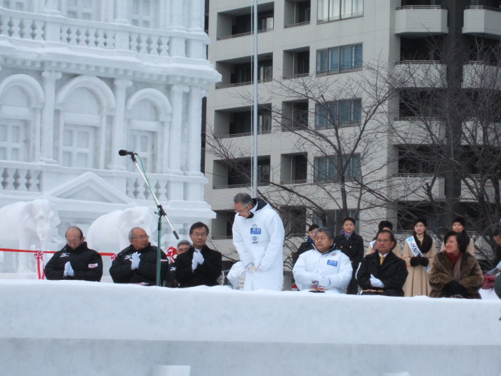 駐日タイ大使は「諸外国の友好を築く場所として歴史的、芸術的に重要であるだけでなくタイ国民の心のよりどころであるチャックリー・マハー・プラサート宮殿が、今年で日タイ修好120周年の記念すべき年にさっぽろ雪まつりで雪像としてつくられることでタイと日本の関係をより深める大きな機会となりました。今日こうして雪で作られた宮殿を見てとても美しく感激いたしました、作成された自衛隊の方々とご協力された方々に大変感謝しています。」などと話されていました。上田文雄札幌市長は「まっしろに輝き、気品あふれるこのチャックリー・マハー・プラサート宮殿を見て大変感動しています。タイと日本の修好120周年の記念の一環として作られたのですが、これを機にさらに両国の友好が深まるようにとりわけこの雪が降る美しい札幌とタイの皆さんの友情が芽生えることを願っています」と話されていました。また上田市長によるとこの式典がインターネットを通じてタイの皆さんに放送されているということで「ぜひ皆さん、この札幌に遊びに来てください。心から歓迎しています」と呼びかけていらっしゃいました。