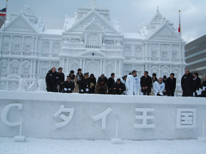 式には駐日タイ大使やタイ国政府関係者、札幌市長、北海道放送社長、さっぽろ雪まつり実行委員会会長が出席し、陸上自衛隊から雪像を引き渡されました。式の前後には自衛隊の音楽隊による演奏でタイの国歌や「好きですサッポロ」などの音楽がながれ、完成したチャックリー・マハー・プラサート宮殿の左右にタイと日本の国旗も掲揚されました。